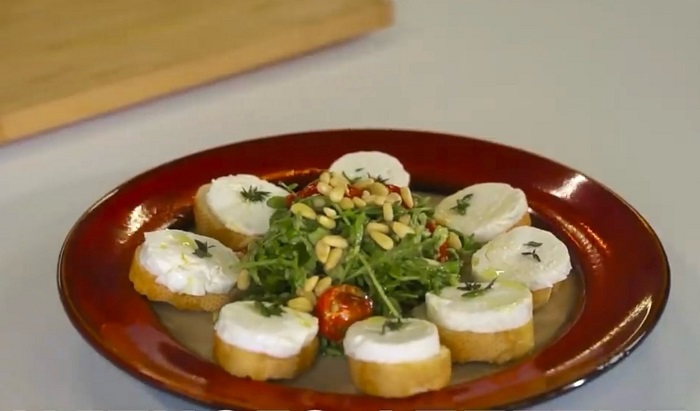 Гренки с козим сыром выкладываем вокруг салата, остается последний штрих - украсить блюдо кедровыми орешками! Изысканный французский салат от Шефа готов! Приятного аппетита!