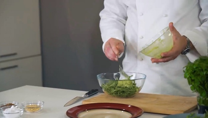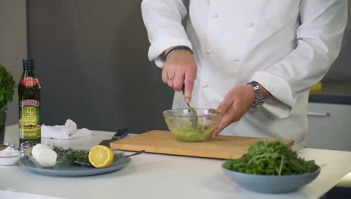 Берем рукколу, добавляем к ней соли. перца, немного зеленого базилика, заправки из авокадо и подвяленных томатов, перемешиваем и выкладываем на плоскую тарелку по центру. -