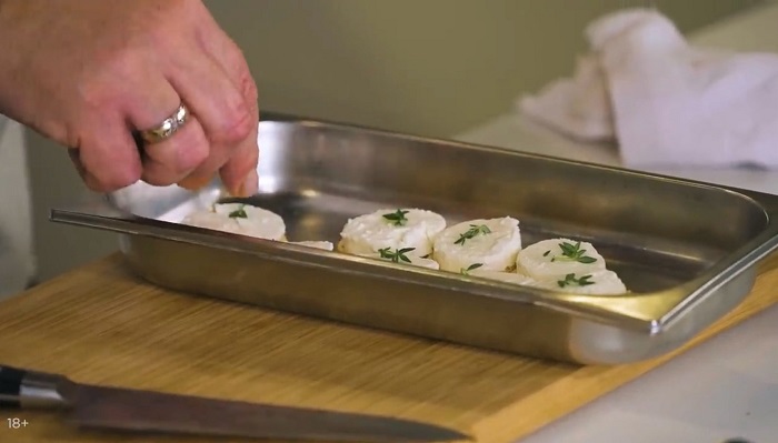 Достаем хлеб из духовки и переворачиваем его не подсушенной стороной вверх, сыр нарезаем кружочками и выкладываем на хлеб, на каждый кусочек сыра выкладываем листочек тимьяна. -