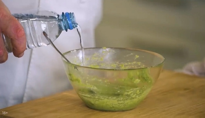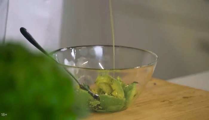 Авокадо очищаем, кладем в глубокую миску, разминаем вилкой, добавляем сок лимона. -