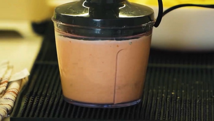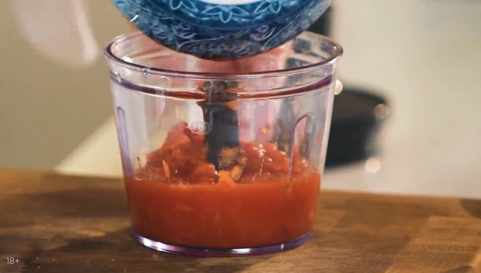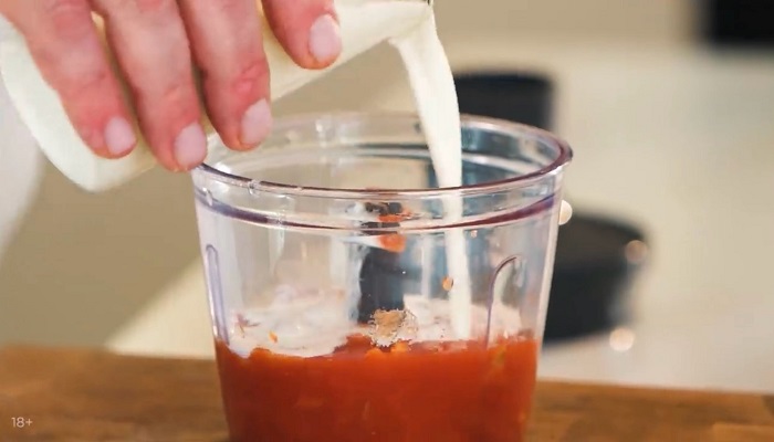 Для соуса в блендер закладываем томаты в собственном соку, немного сахара, соли, жирных сливок и зелёного базилика. Пробиваем до однородной массы. -