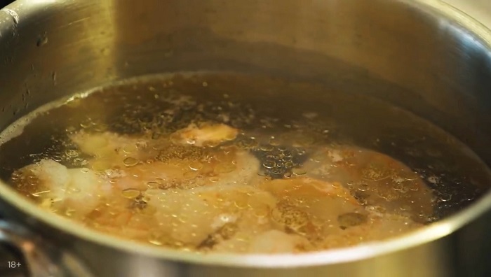 В подсоленную кипящую воду с добавлением оливкового масла закидываем креветки, провариваем 1 минуту и обираем под холодную воду. -