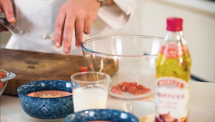 Помидоры черри и моцареллу нарезаем на четвертики, закладываем в миску. -