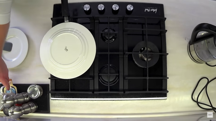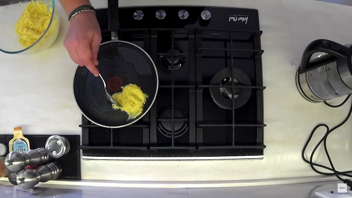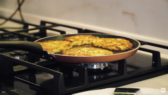 После того, как с двух сторон образовалась хрустящая корочка, накрываем сковороду крышкой или как Шеф всея Руси тарелкой и даём драникам пропариться 3-4 минуты -