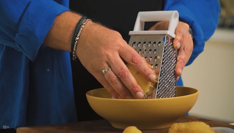 Запечённый картофель натереть на крупной терке, посилить, поперчить. -