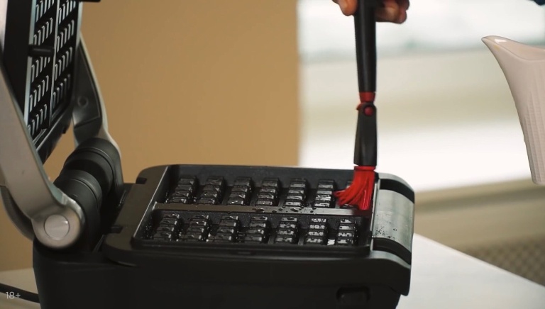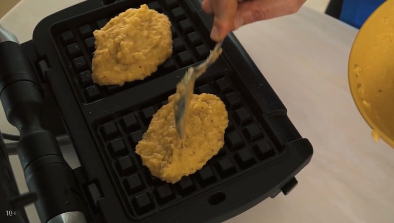 Разогретую вафельницу смазываем растительным маслом, выкладываем на неё картофельную массу, закрываем и выпекаем 10 минут. -
