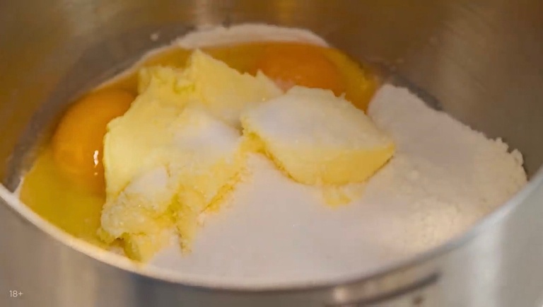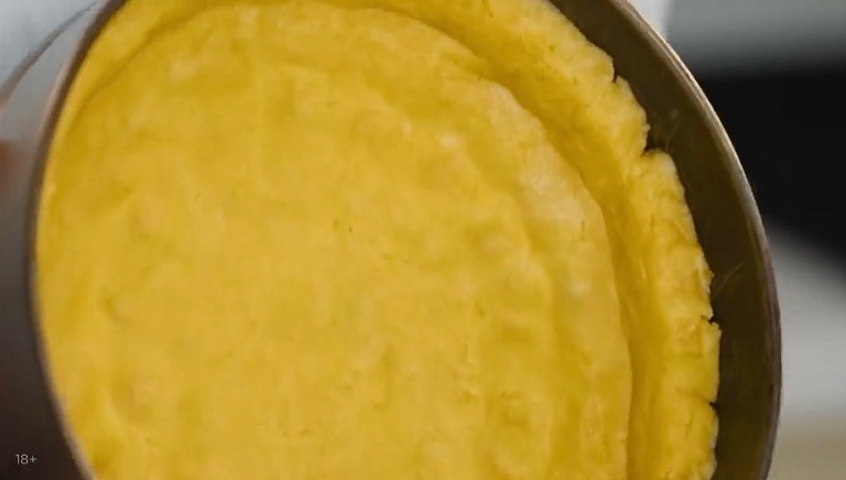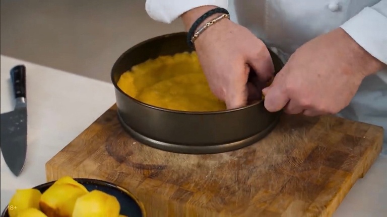 Для начала приготовим песочное тесто. В дежу высыпаем муку, в неё два яйца, сливочное масло, сахар и соль. Тесто замешиваем, разминаем, утрамбовываем в форму и делаем борт, затем нужно пройтись вилкой по тесту, делая небольшие дырочки и убрать в холодильник. -