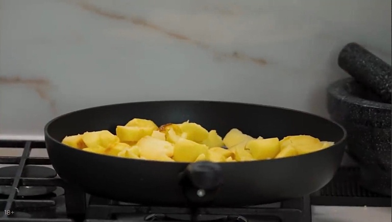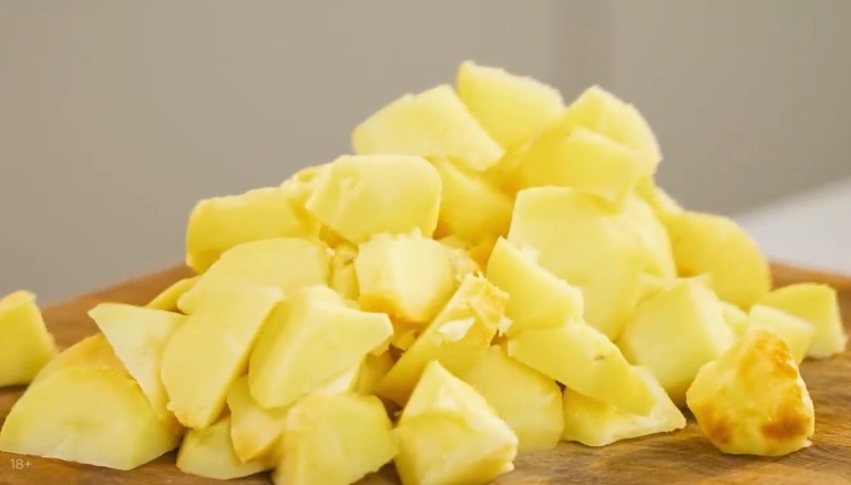 Перейдём к начинке. В сковородку положим достаточное количество сливочного масла, растопим его. Печёный картофель нарезаем и закидываем обжариваться к маслу. -