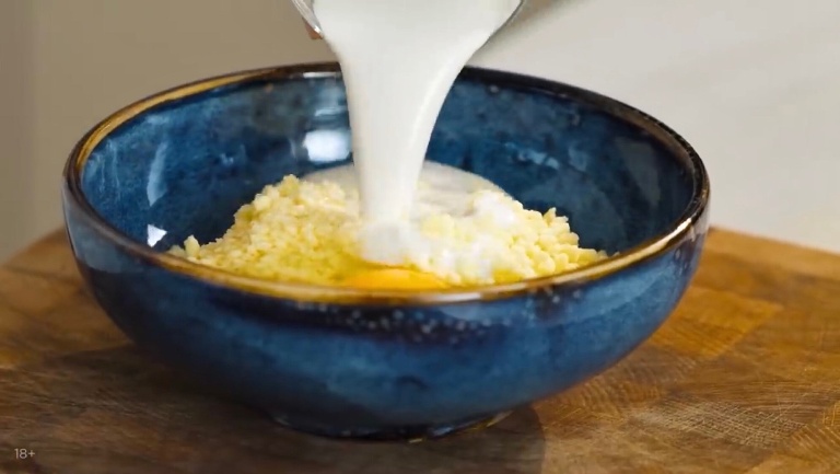 Теперь приготовим соус. Для этого тёртый сыр мы замешаем с одним яйцом, сливками и добавим немного копчёной паприки и тимьяна. -