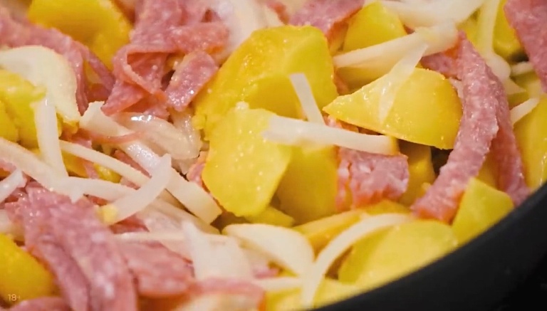 Теперь лук и салями тоже можно отправить к картофелю, посолить и поперчить. -