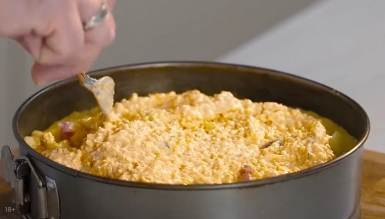 Достаём из холодильника тесто, в него выкладываем нашу начинку, а сверху соус. Выравниваем пирог и отправляем его запекаться в разогретую до 170 градусов духовку на 50 минут. Наш картофельный пирог от шефа готов!