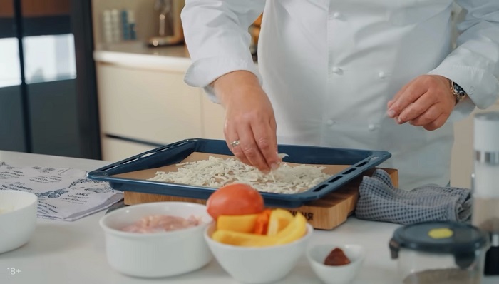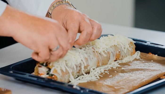 Выкладываем рулет на пергамент, сверху посыпаем тертой моцареллой и снова ставим в разогретую до 190 градусов духовку на 20 минут. -