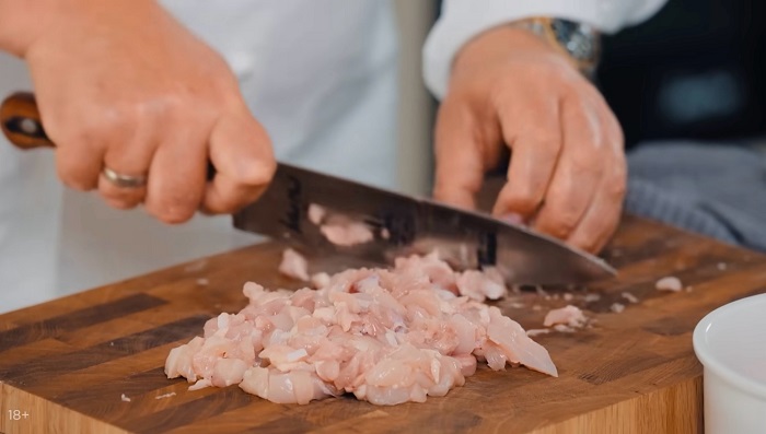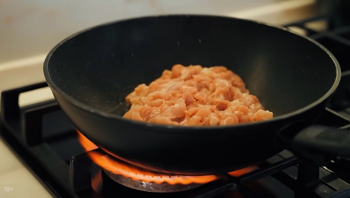 Куриное филе нарезаем мелким кубиком и обжариваем на оливковом масле. -