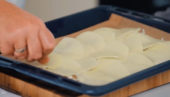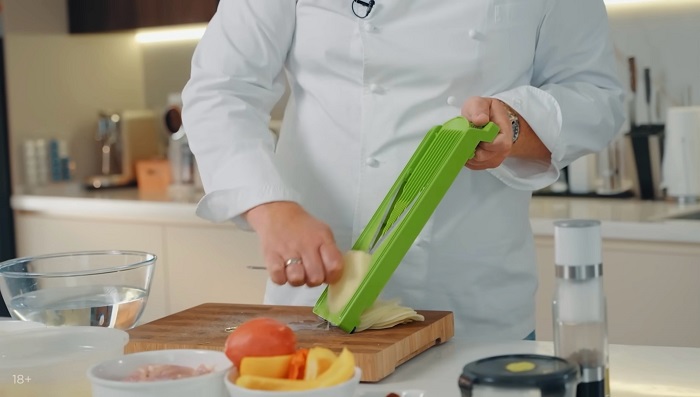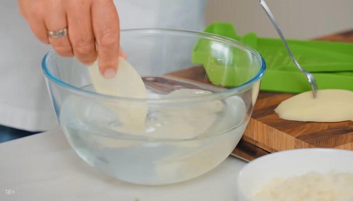 Очищенный картофель с помощью овощерезки нарезаем на тонкие слайсы, затем лучше убрать их в воду на 10 минут. -
