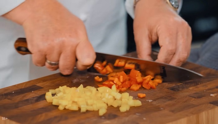 Болгарский перец, помидор и вяленые томаты также нарезаем мелким кубиком и закидываем к курице, солим, перчим, обжариваем до готовности. -