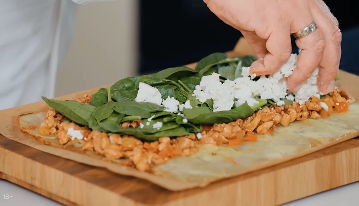 Начинаем собирать рулет. Начинку с курицей и овощами выкладываем на картофель, сверху выкладываем свежий шпинат и фетаксу, заворачиваем рулет. -