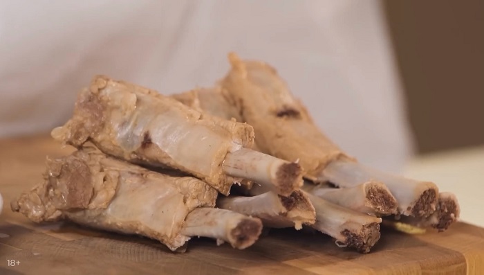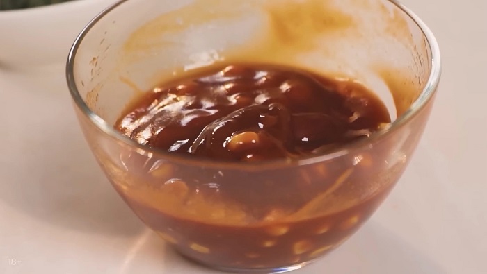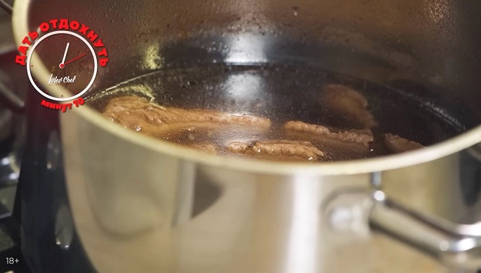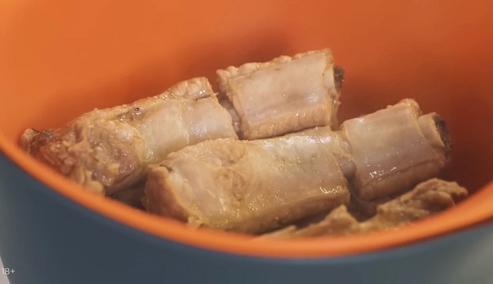 Когда ребра сварятся добавляем к ним немного соевого соуса и даем им отдохнуть минут 10, затем откидываем ребра на дуршлаг и охлаждаем. -