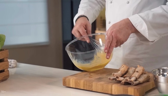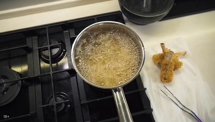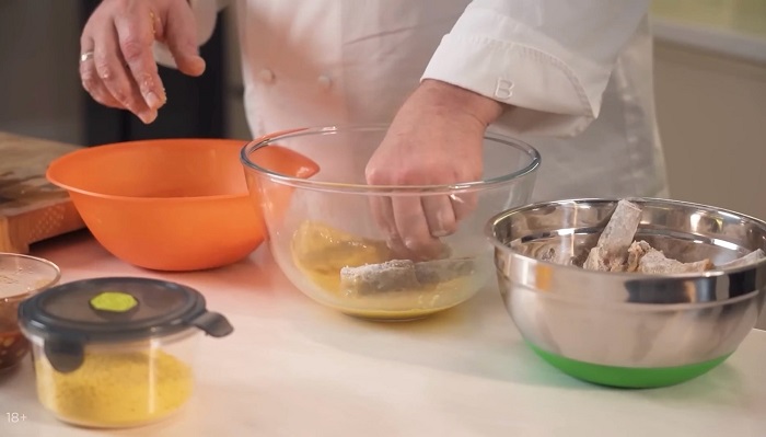 Ребра сначала обваливаем в муке, затем опускаем в яичную смесь, а затем в панировочные сухари, опускаем ребра во фритюр, обжариваем до золотистого цвета, затем откидываем на салфетку. -