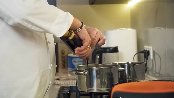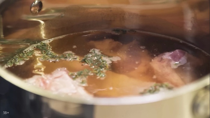 Ребра обрезаем, в кастрюлю вливаем пиво и немного воды, добавляем немного тимьяна, привариваем ребра в пиве 20-25 минут на медленном огне. -