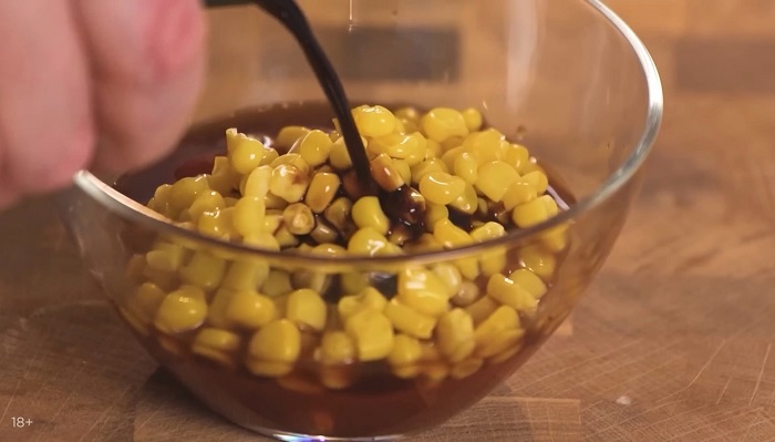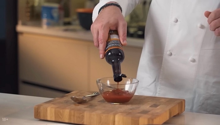 Теперь приготовим домашний соус барбекю. Для этого смешаем кетчуп с табаско, соусом ворчестер, соевым соусом и кукурузой. -