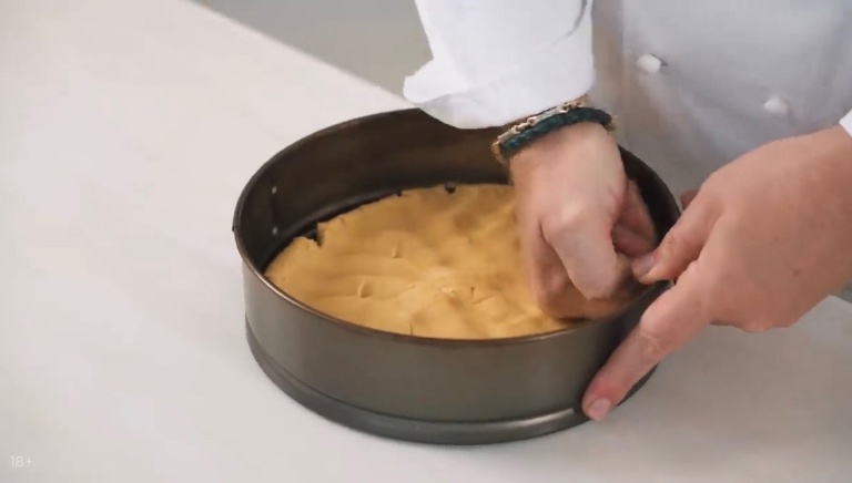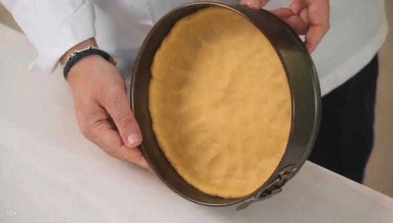 Берём круглую форму для запекания, утрамбовываем в неё тесто, делаю борты высотой примерно 2 сантиметра. -