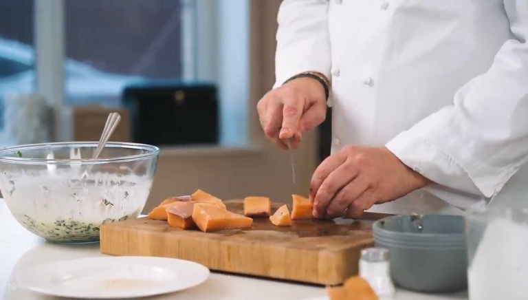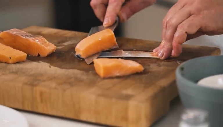 Филе сёмги нужно снять с кожи, нарезать крупными кусочками и закинуть к шпинату. -