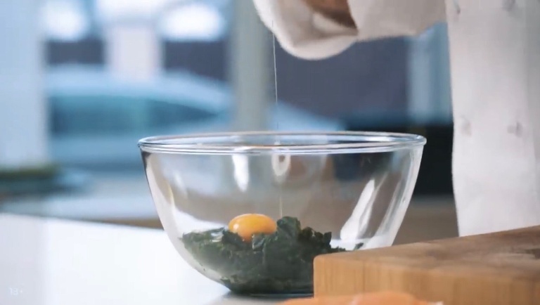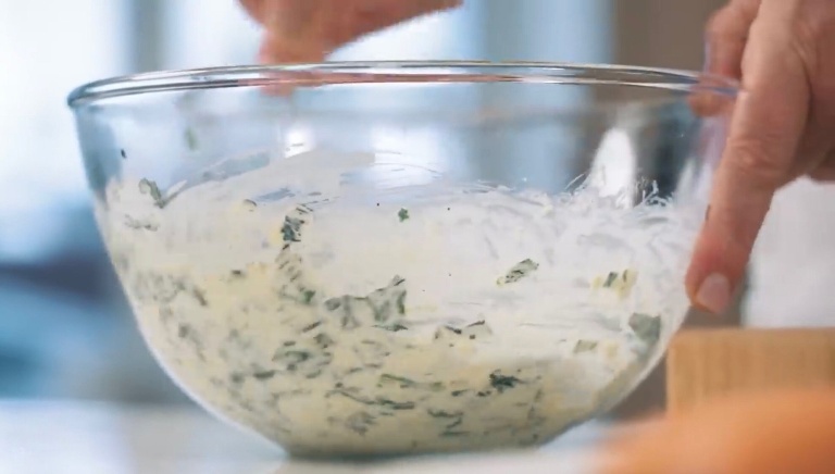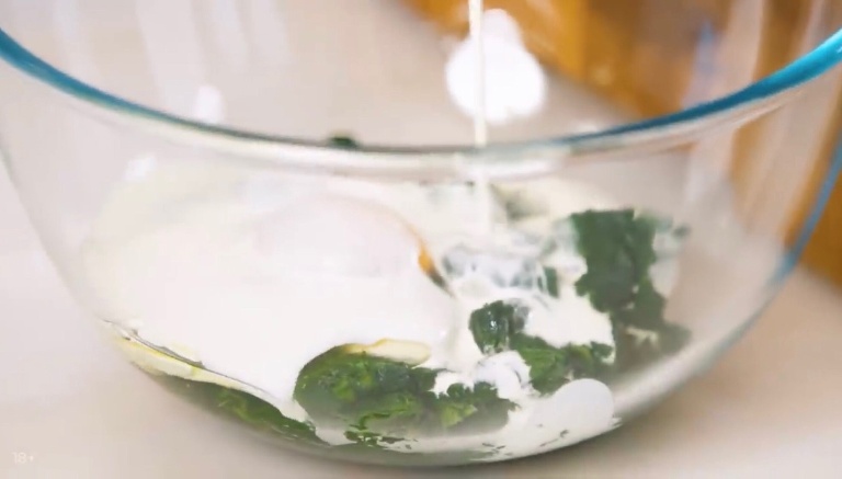 В шпинат вбиваем еще 2 яйца, вливаем жирные сливки, тёртый сыр, соль и перец, всё перемешиваем. -