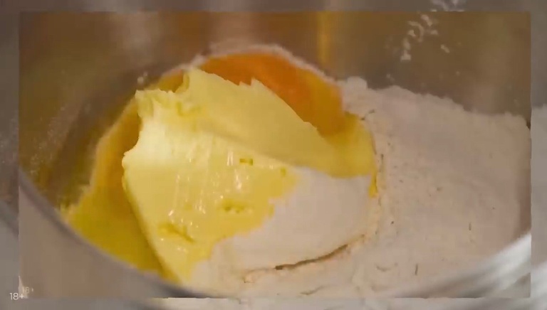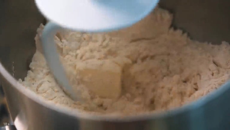 В первую очередь приготовим песочное тесто. В миксер закладываем муку, 2 яйца, сливочное масло, сахар и соль, замешиваем. -