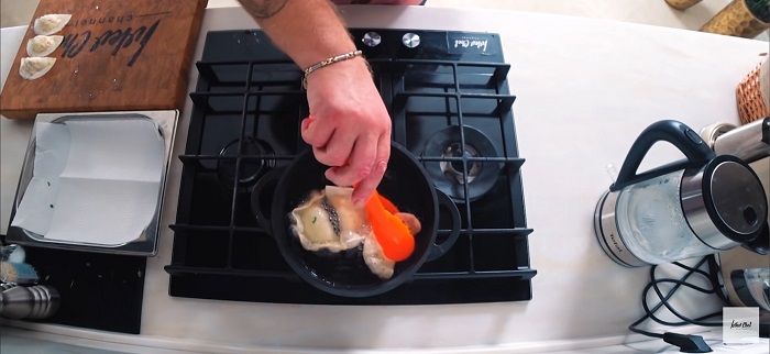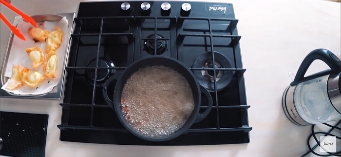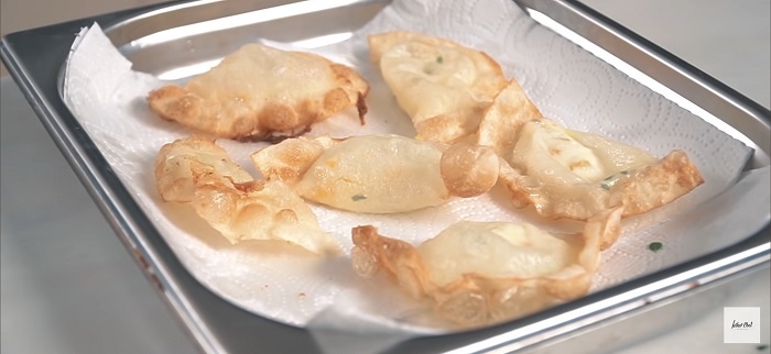 Конвертики закидываем в кастрюлю с раскалённым маслом и обжариваем буквально по пол минуты, затем выкладываем на салфетку чтобы ушло лишнее масло. -