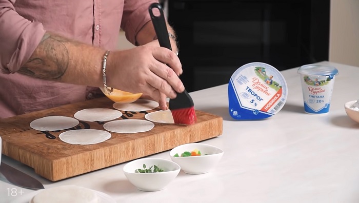 Тесто смазываем яйцом, выкладываем на него начинку и заворачиваем как вареник. -