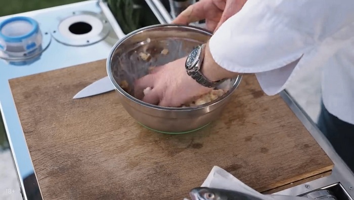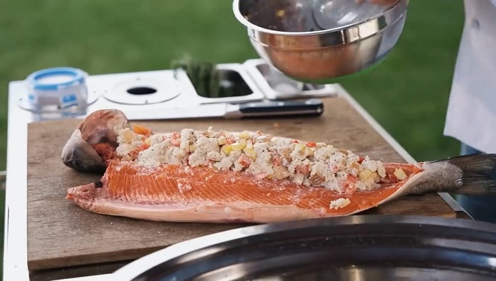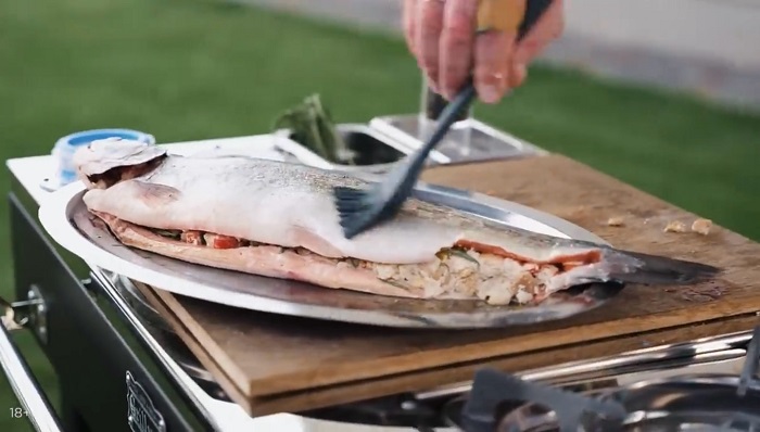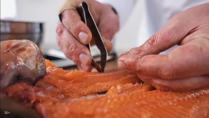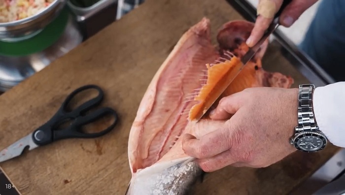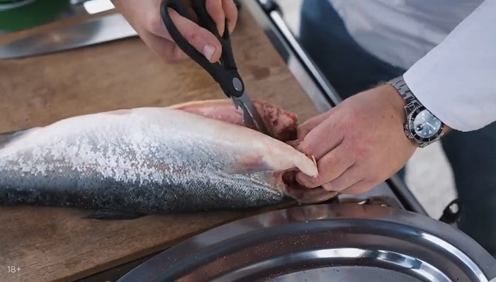 Обрабатываем форель (вырезаем жабры, удаляем кости, но при этом все рыба должна остаться на коже). -