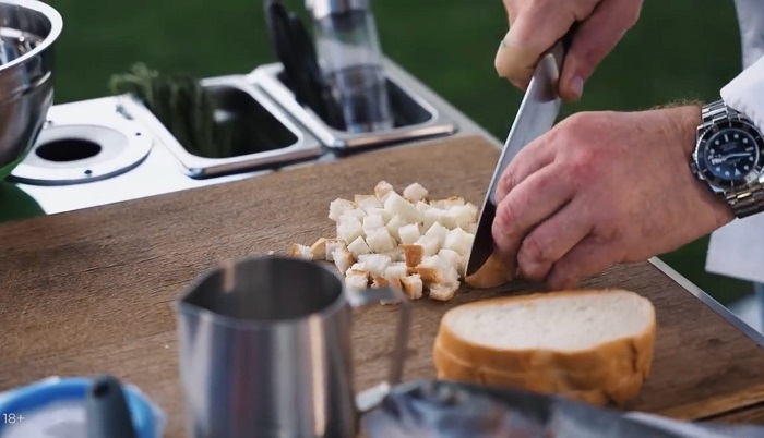 Хлеб нарезаем кубиком, кладем в глубокую миску. -