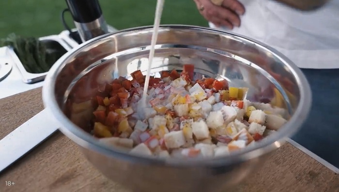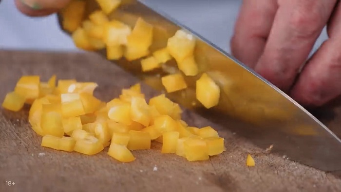 Сладкий перец тоже нарезаем кубиком, закидываем к хлебу. -