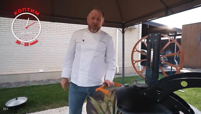 Ставим поднос на гриль, накрываем крышкой и коптим в течение 20-25 минут. -
