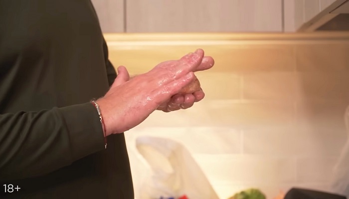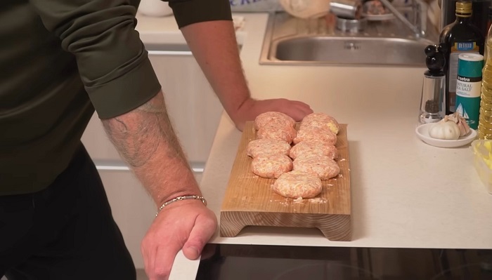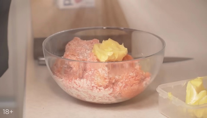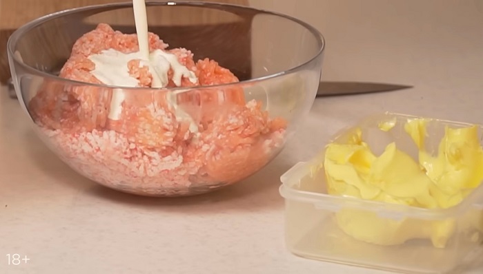 Добавляем в фарш соль, вводим сливки и сливочное масло комнатной температуры, замешиваем и убираем в холодильник на 20 минут. -