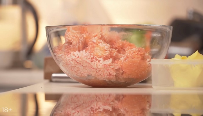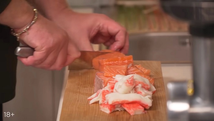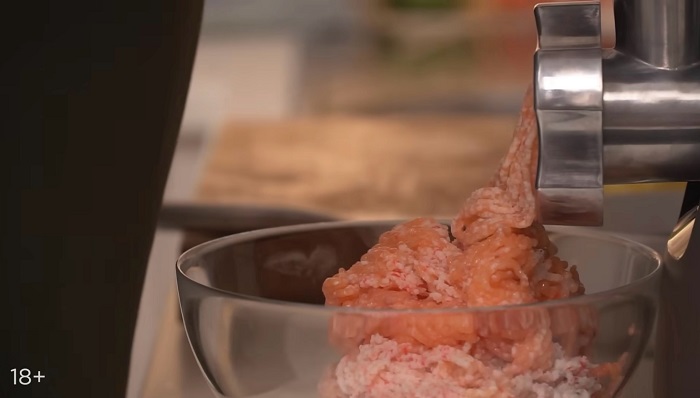 Крабовые палочки, креветки и филе лосося подготавливаем и прокручиваем через мясорубку. -