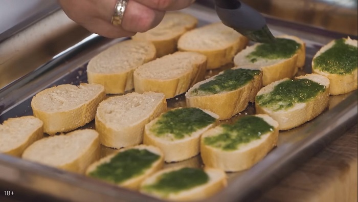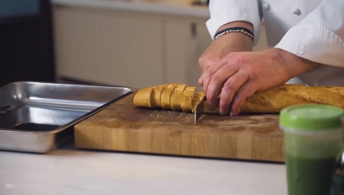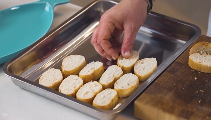Нарезаем багет, выкладываем его на противень и ставим подсушиться в духовку на 3 минуты при 200 градусах. -