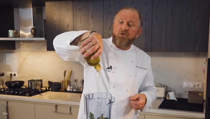 В блендер закладываем базилик и чеснок, добавляем соли, оливкового масла, закидываем петрушку и пробиваем. -