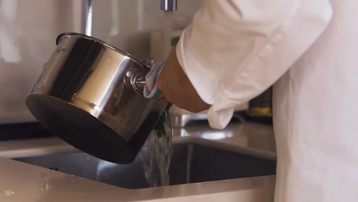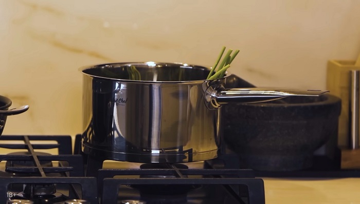 В сотейник вливаем воду, ставим на огонь, когда она закипела опускаем в неё петрушку на пол минуты, а затем обдаём её холодной водой. -