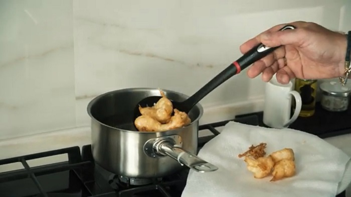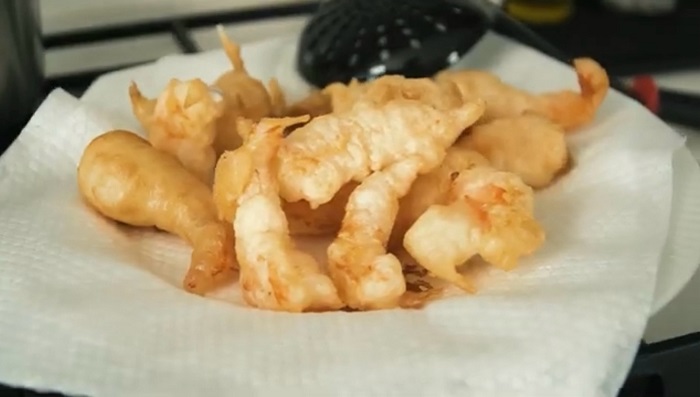 Закидываем креветки во фритюр с раскаленным маслом, обжариваем до появления золотистой корочки, а затем перекладываем их на салфетку. -