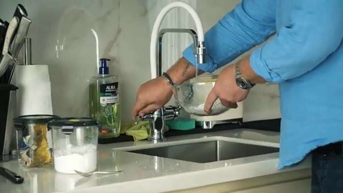 Васаби заливаем небольшим количеством теплой воды, размешиваем, добавляем майонеза и сгущенки и все это хорошо перемешиваем. -