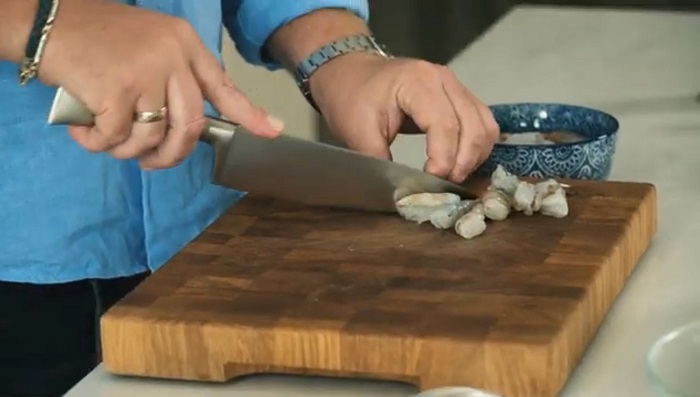 Креветки режем на две части. -