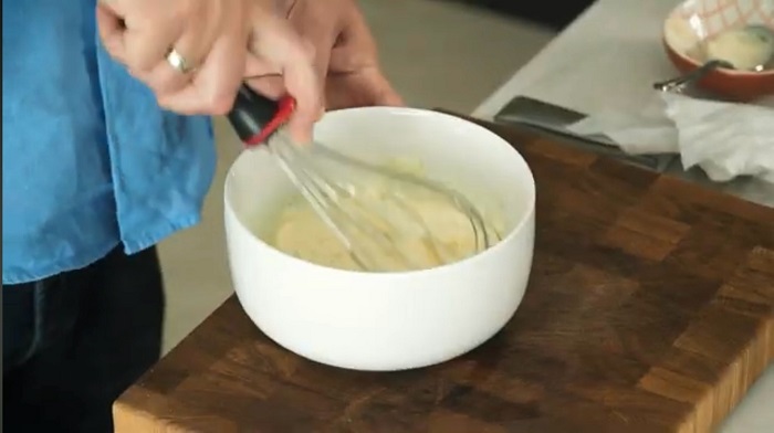 В темпурную муку добавляем немного кукурузного крахмала и вливаем немного воды, перемешиваем все венчиком так, чтобы не оставалась комочком и закидываем в эту массу креветки, хорошо обваливаем их. -