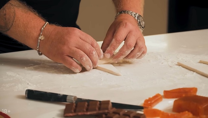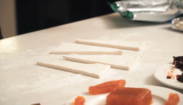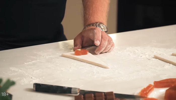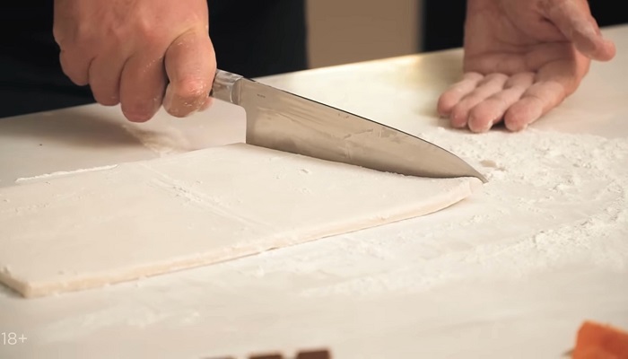 На стол высыпаем немного муки, выкладываем тесто и нарезаем его треугольниками. -