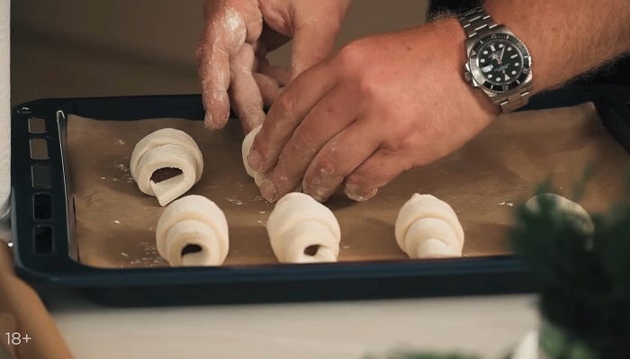 На каждый треугольник выкладываем начинку, заворачиваем и выкладываем на противень с пергаментом подальше друг от друга. -