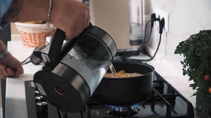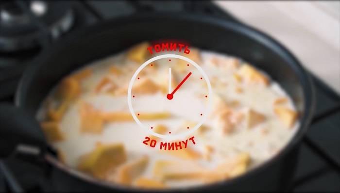 Вводим сливки и воду, сразу добавляем соль и белый перец, доводим до кипения, уменьшаем огонь и при медленном огне томим в течение 20 минут. -