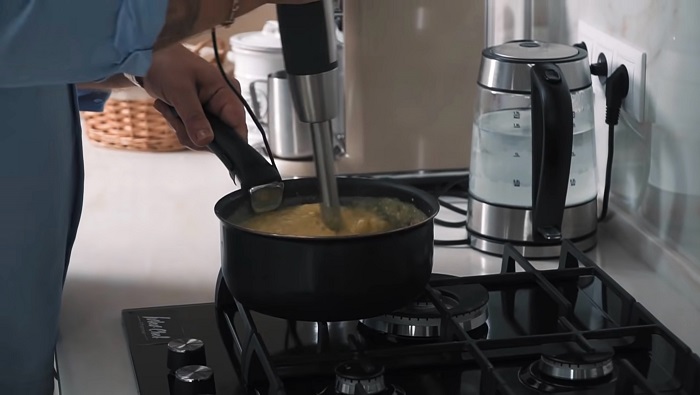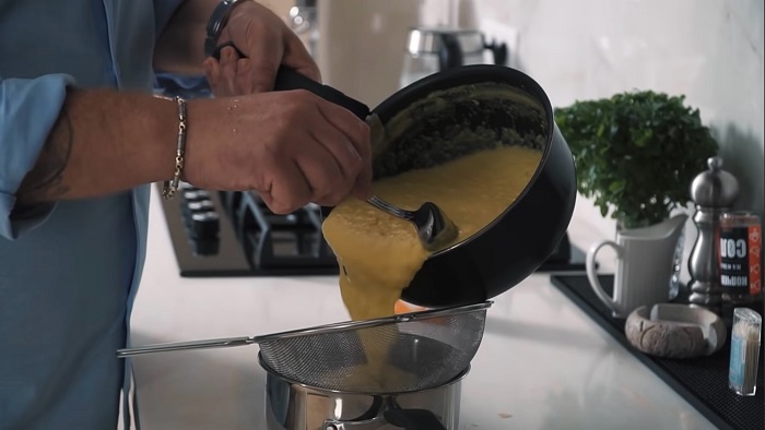 Блендером пробиваем суп до однородной массы, а затем процеживаем через сито. -