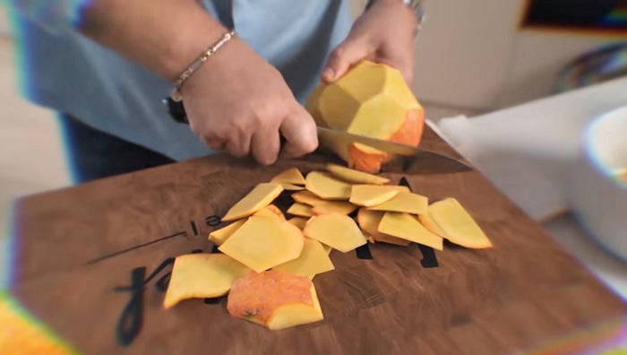В первую очередь обрабатываем тыкву от семечек и кожуры, затем почищенную тыкву режем на произвольные мелкие куски. -