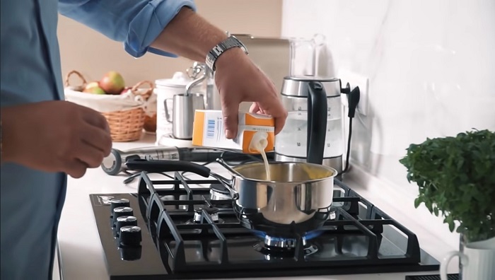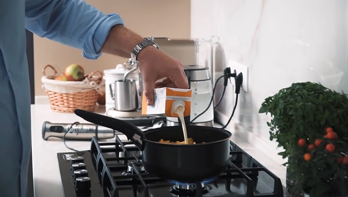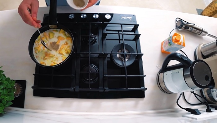 Снова ставим суп на огонь, добавляем ещё немного сливок и воды, хорошо мешаем, доводим до кипения и снимаем с огня. -