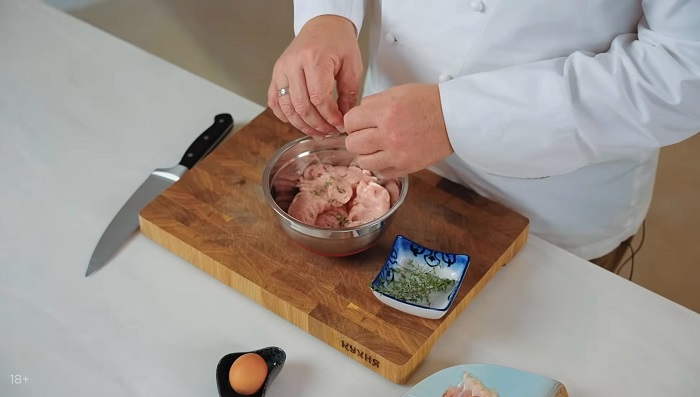 В глубокую миску закладываем куриный фарш, добавляем тимьян, соль и перец, разбиваем яйцо, мешаем. -